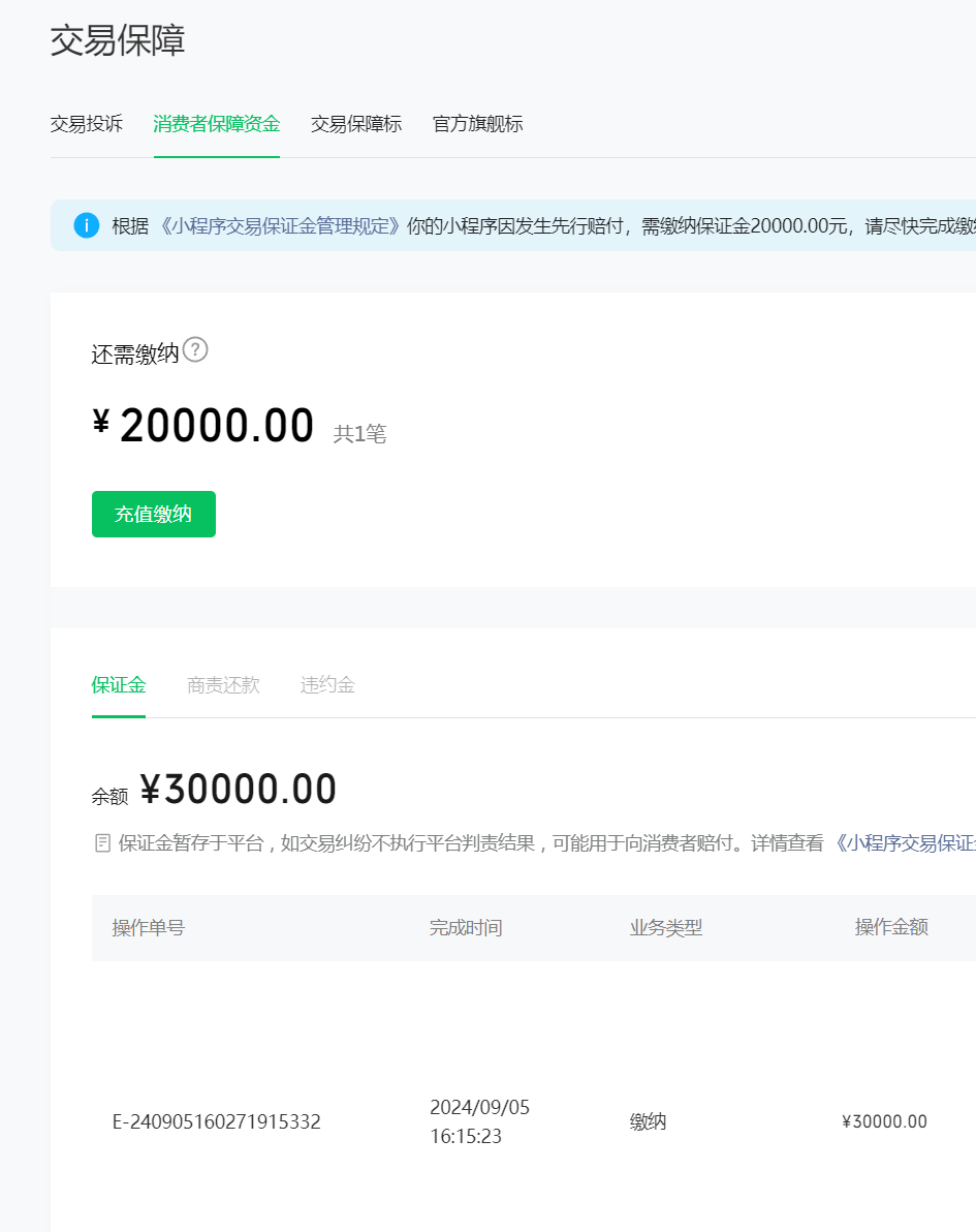 详情可查看小程序交易保证金管理规定https://developers.weixin.qq.com/miniprogram/dev/platform-capabilities/business-capabilities/ministore/minishopopencomponent2/baozhengjin.html