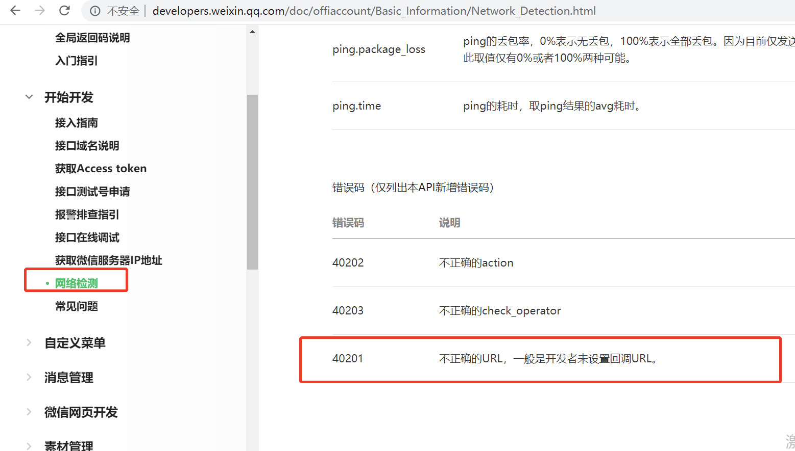 请问微信公众平台网络检测接口40201错误码告知的URL在哪设置?如何设置?