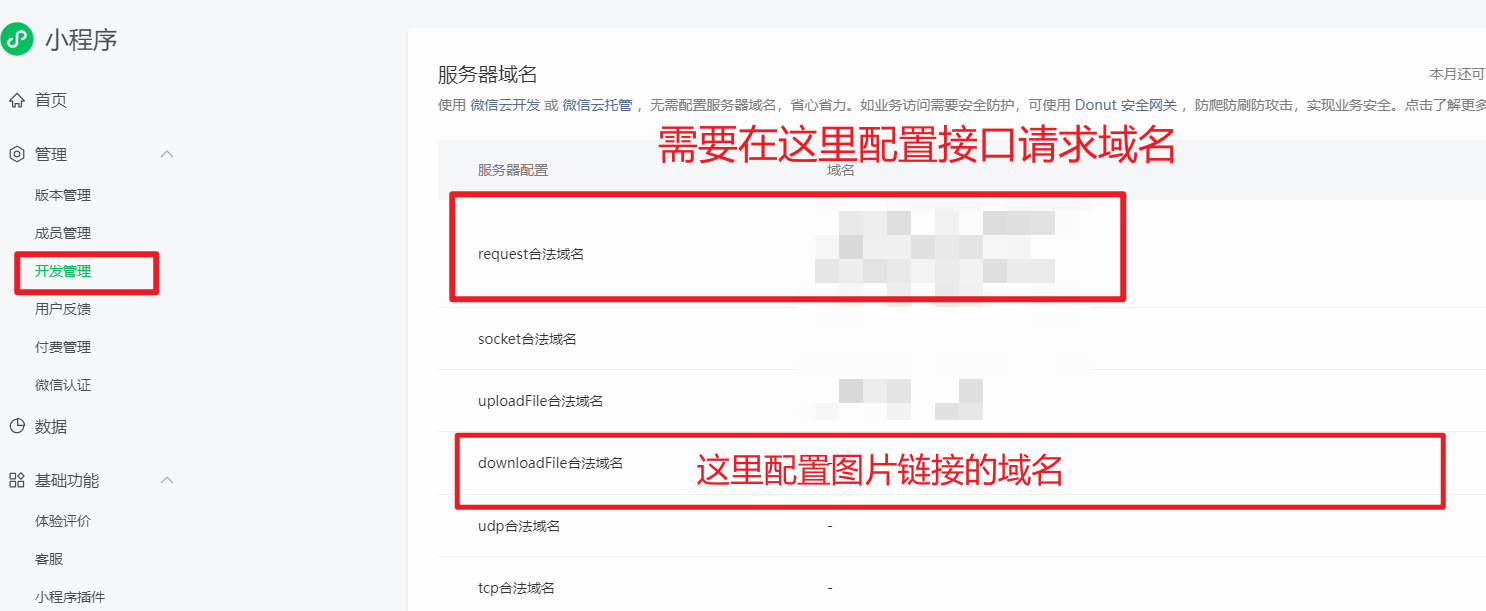 开发管理-服务器域名-request合法域名这里没有设置,需要包含第三方的,例如友盟统计这些的