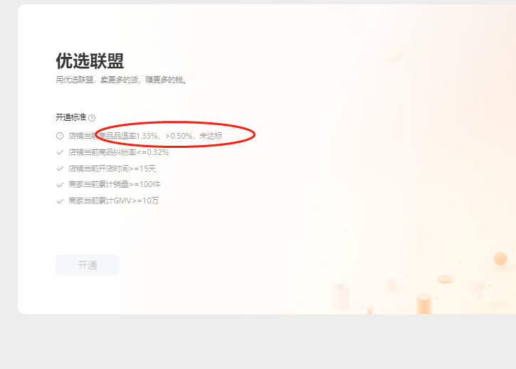 问题2:优选联盟权限给关闭,提示品退率过高(1.32%),大于你们说的标准0.49%,请问你们的规则是1% 到6%,根据类目定的,对吧,那我所主营类目的品退率要求是4%,那怎么给我关闭了呢??那你们所谓的这个0.49又是从哪儿来的呢??规则你们是定好了,结果我们遵守,你们又不遵守,随意指鹿为马了么?