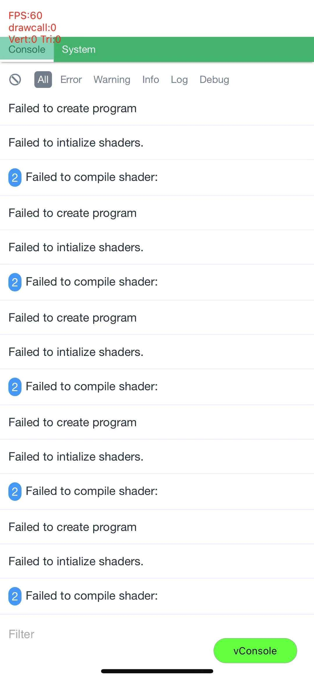 小游戏一加载就报Failed to intialize shader 和Failed to create program,请问是什么原因,详见附图