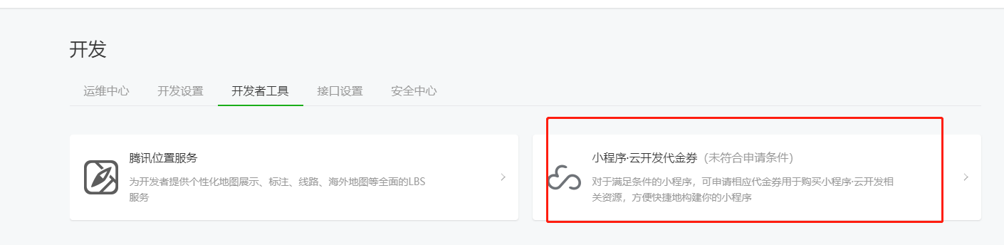 我想在开发者工具里面使用通讯云来调试后端。但我的该处页面显示小程序-云开发代金劵(未符合申请条件),不知道是什么原因引起的。我看的教学视频也这个页面不一样。需要热心的老司机指点指点。谢谢了。