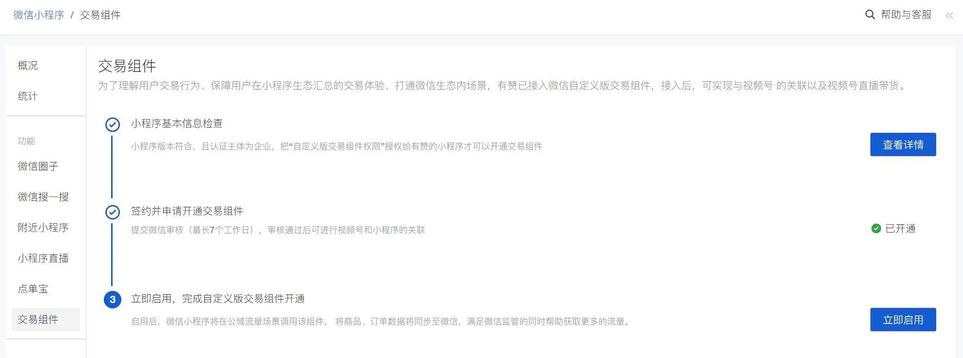 第二步签约并申请开通交易组件已经审核过了,第三步提示“立即启用”,然后我点击了立即启用,页面也没有跳转,一直停留在这,也不显示已完成。还有就是我看别人开通成功后这个页面会显示基本信息,还可以添加商品类目,我的现在却停在这里了。请问是怎么回事呢?