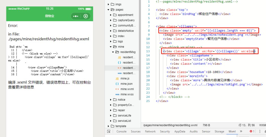 不支持wx:for和wx:else同时使用在一个标签上,您可以使用 block