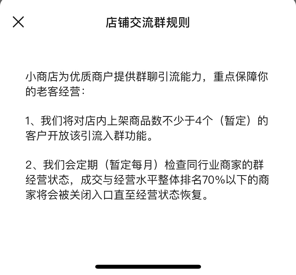 这里有一个卡点需要注意:店铺群需要先绑定微信群,微信群及其群员必须是本企业的微信群,群聊是微信全员参与的。这个绑定的微信群一旦有外部人员进入,就等于客户在和所有人共享聊天了;假如你也不想将你的客户分享给本公司其他业务人员,显然这个群聊也是不合适的. 这是我的试验总结。
