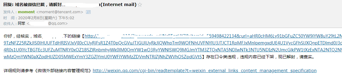 如果是域名被微信屏蔽了,可以发邮件到moment@tencent.com,基本秒回
