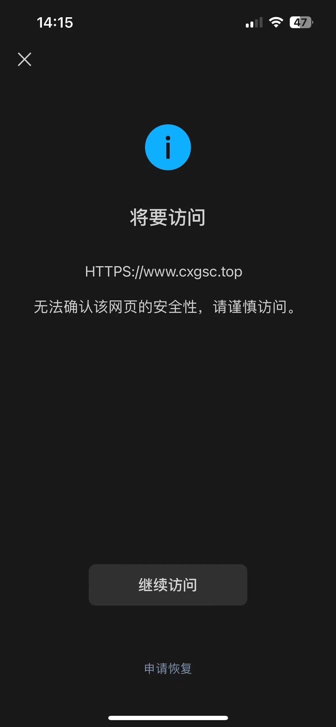 https://www.cxgsc.top (已备案)通过微信访问网站出现“无法确认该网页的安全性,请谨慎访问”,经检查网页里没有不安全的内容。申请恢复正常访问。