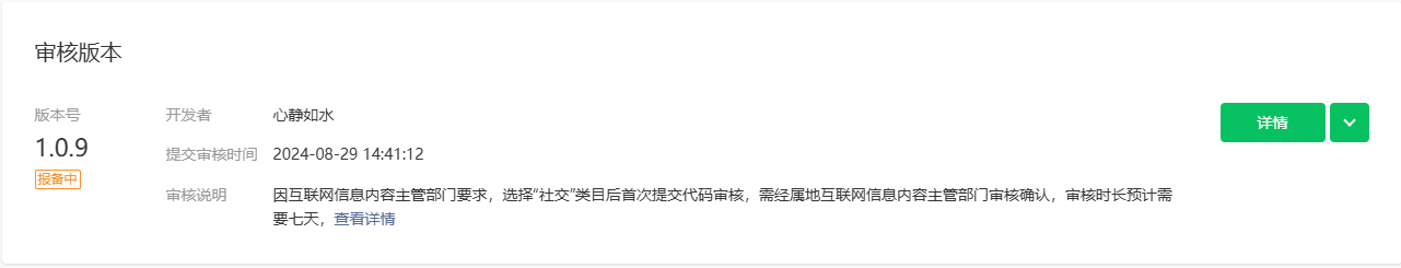 1.小程序涉及报备类目【社交_笔记】类目首次提审,当前已于【2024-08-29】进入报备审核,预计今天下午可返回预上线通知,届时可以支持小程序预上线~。