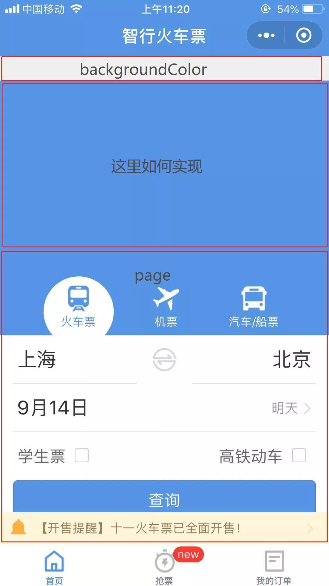 如智形火车票小程序,他应该是在page上面定位了个蓝色图层从而遮住了backgroundColor的灰白。可是我绝对定位了一个view位于page的顶部并且突出一节,并设置了page的overflow:visible。给page加margin-top能看到view突出的那截蓝色,但是用苹果真机测弹性上下拉的时候还是现实灰白的backgroundColor。请问如何解决这个问题。