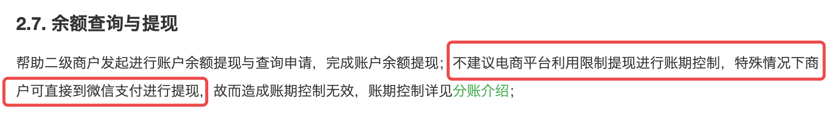 3、企业类型二级商户,可以直接在微信支付商户后台进行提现,导致与平台的可提现余额数据无法同步及管控。(个人建议,应该关于微信支付商户后台的提现入口,统一由平台方调用接口发起)