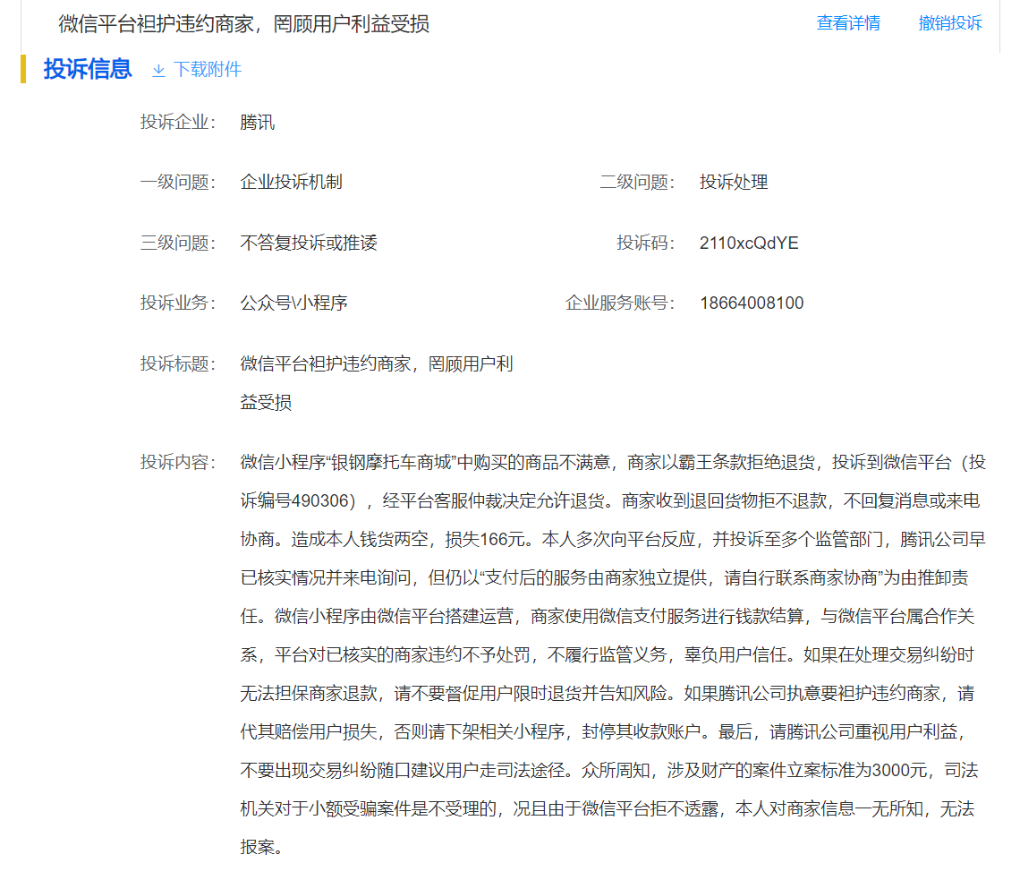 商家对微信平台的退款判决拒不执行,腾讯公司不打算尽一点应尽的义务?任由消费者权益受损?投诉到工信部,12315,都没对商家进行任何处罚。