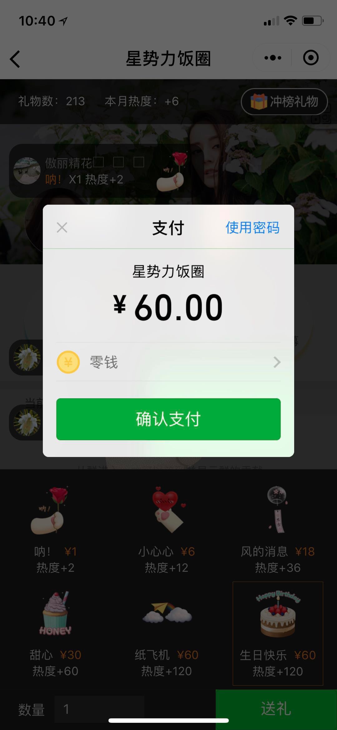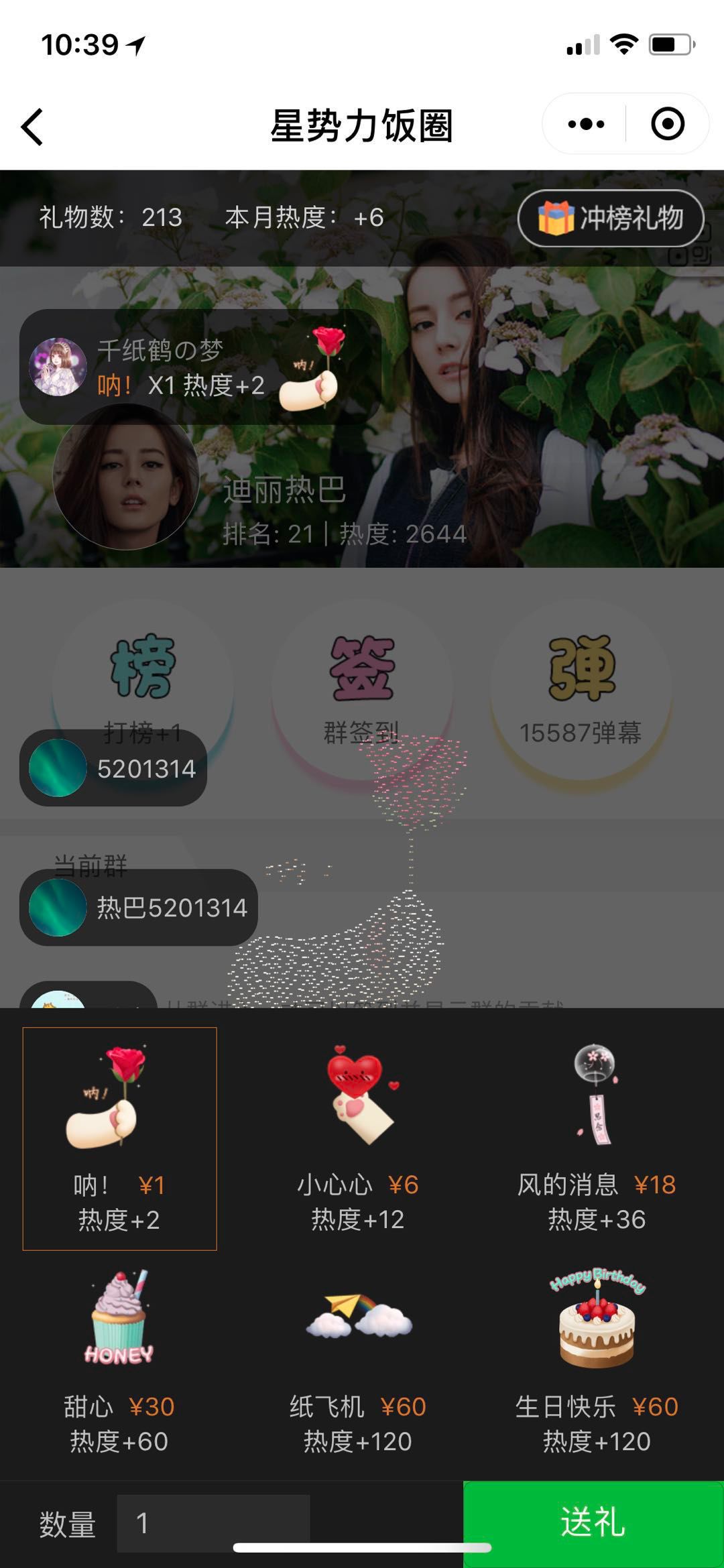 支付页面:点击首页的明星进入明星页面,再点击弹幕,会在右上角弹出“冲榜礼物”