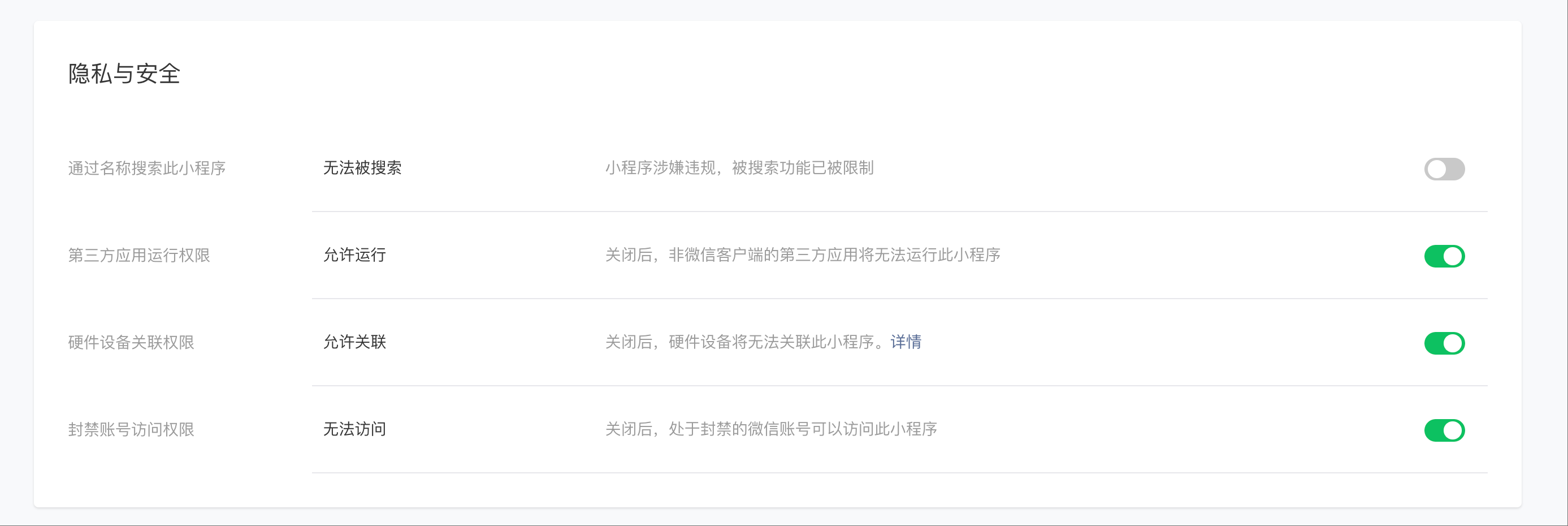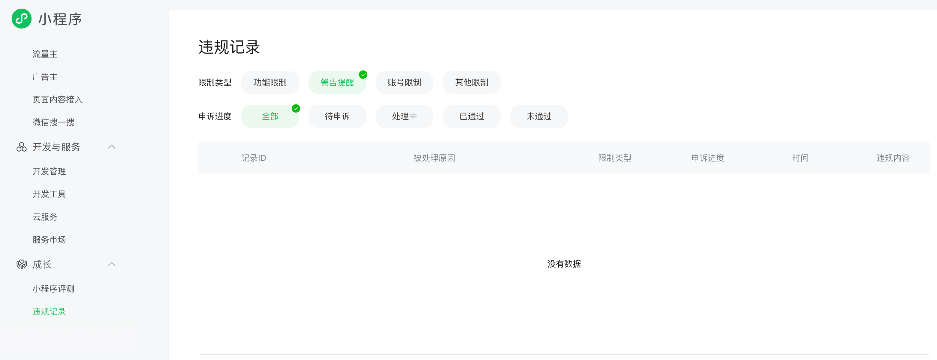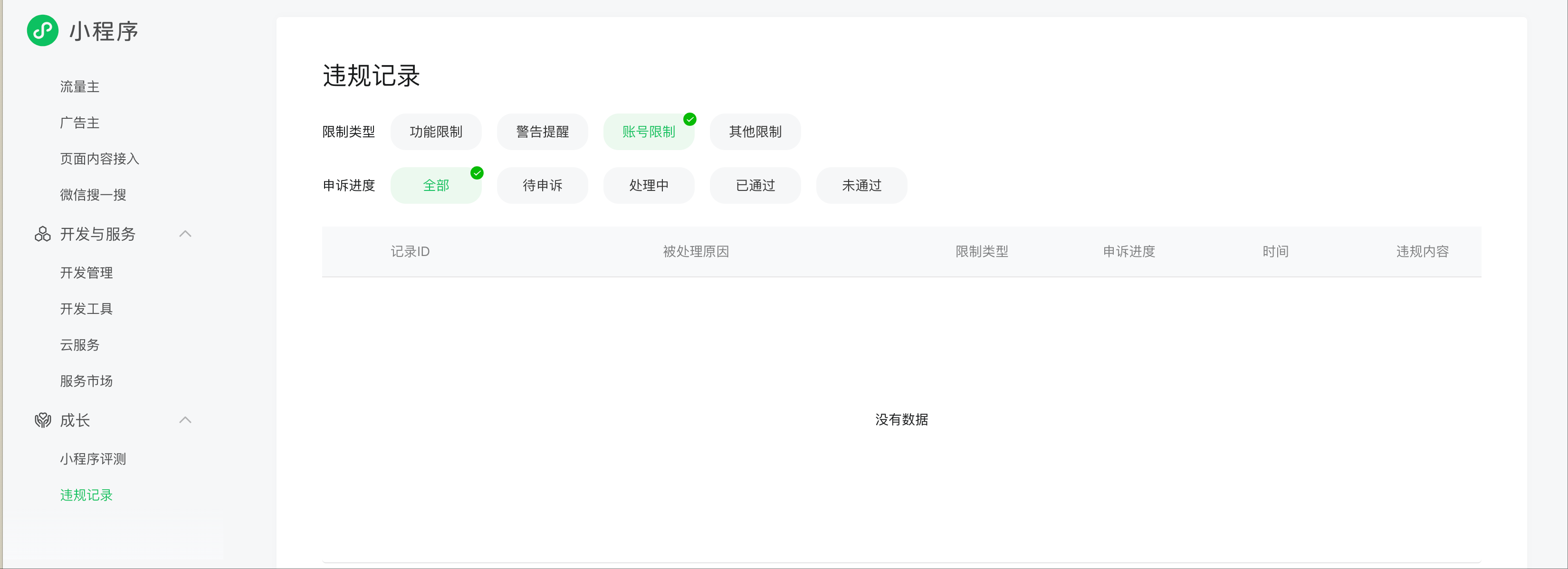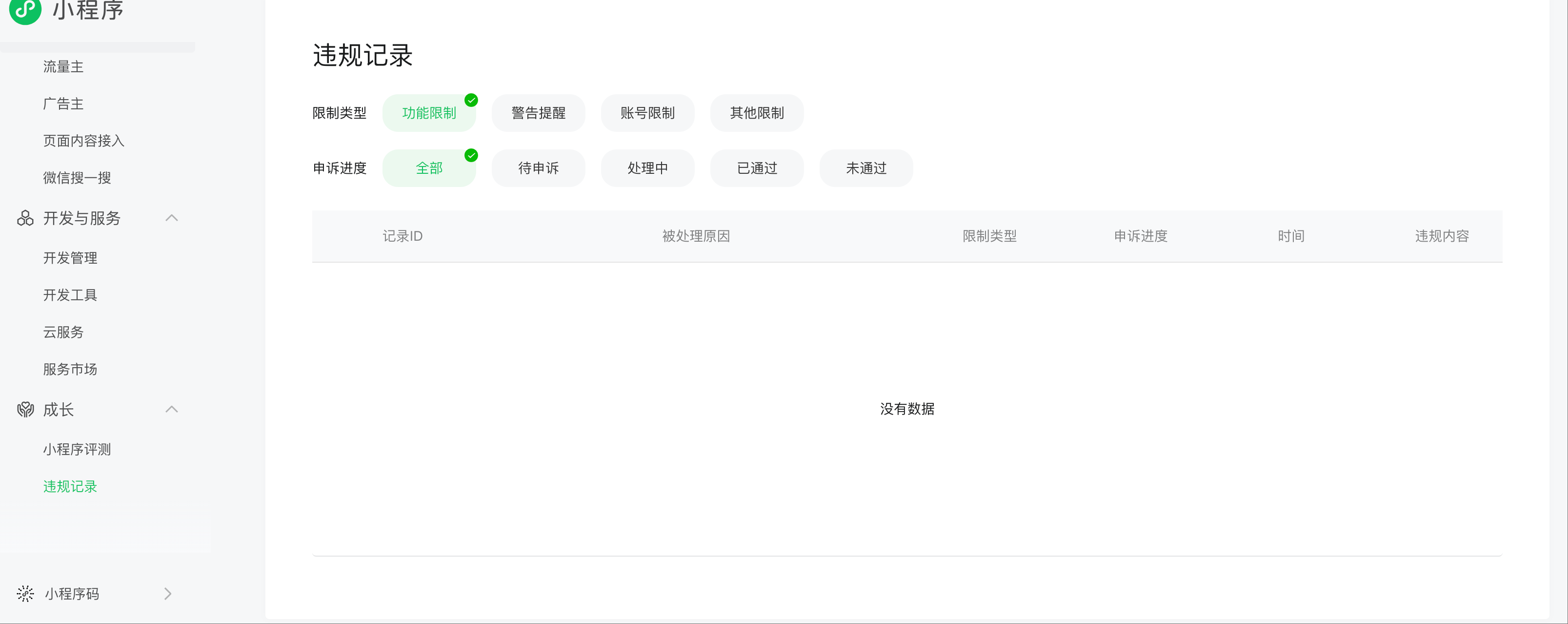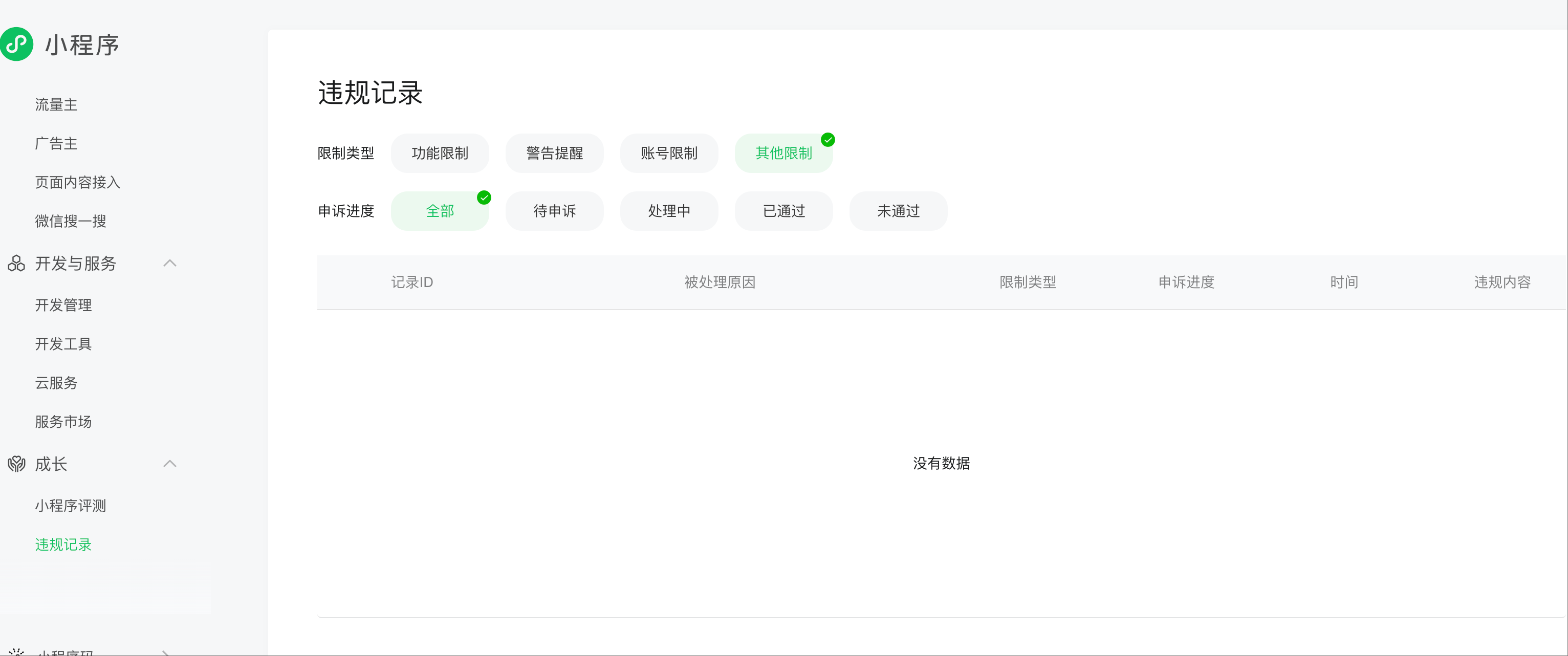 如下图中内容,隐私与安全里面,提示”小程序涉嫌违规,被搜索功能已被限制“、但在违规记录里面,没看到内容。很迷惑,我改怎么处理?