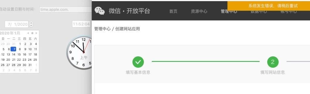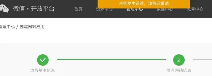 在微信开发平台创建网站应用,一直提示“系统发生错误、请稍后再试”,1月6号晚上试了几次,7号早上试也几次,一直都是这个提示