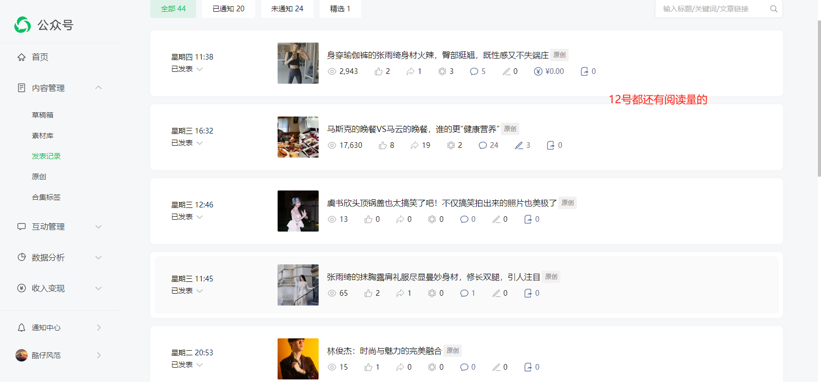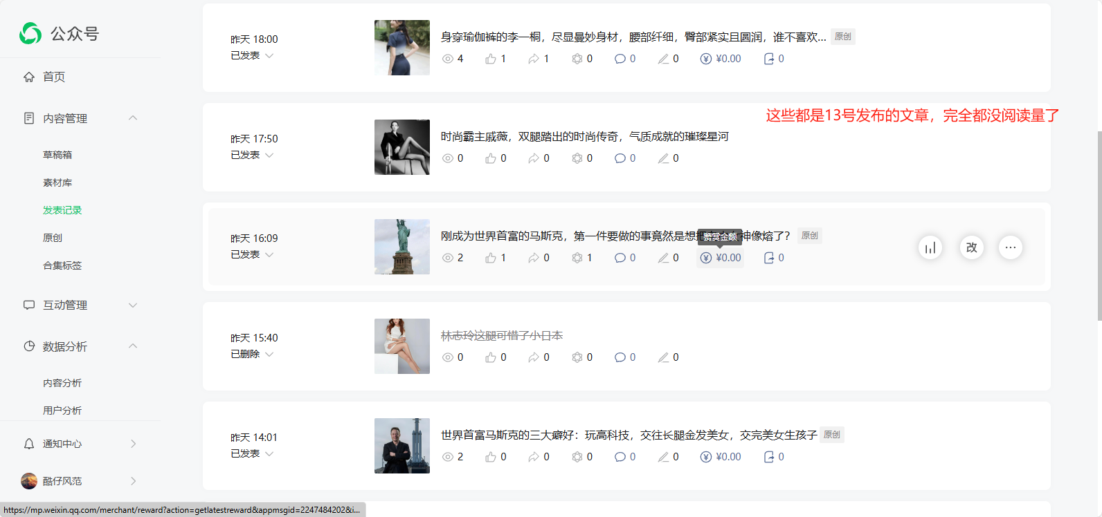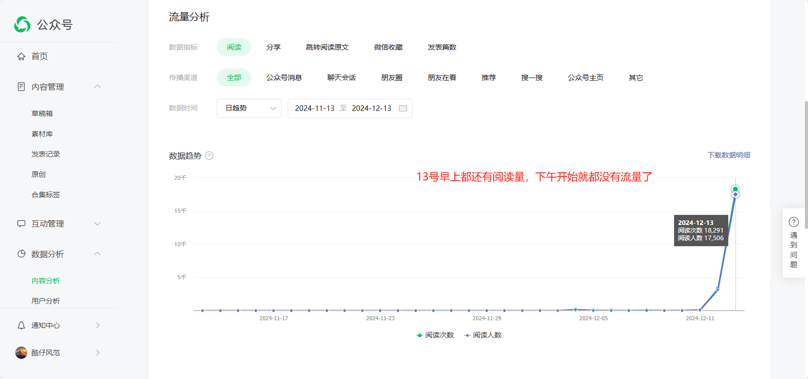 问题:我的账号在2024.12.13日的早上还能获得平台的推荐,然后在下午就直接没了,当天新发布的文章也是0阅读量,截止至反馈问题事件我的账号不管是新发布还是以前的文章,均都没有阅读量,账号也没通知有违规行为,这就让我非常不理解,为啥没有违规,文章也继续更新,怎么账号突然就完全没流量了呢?现在也还有一张助推券,但是新发布的文章也是没法用?麻烦帮忙查一下我的账号是怎么回事,如果违规了,麻烦说一下是违法什么规则。谢谢