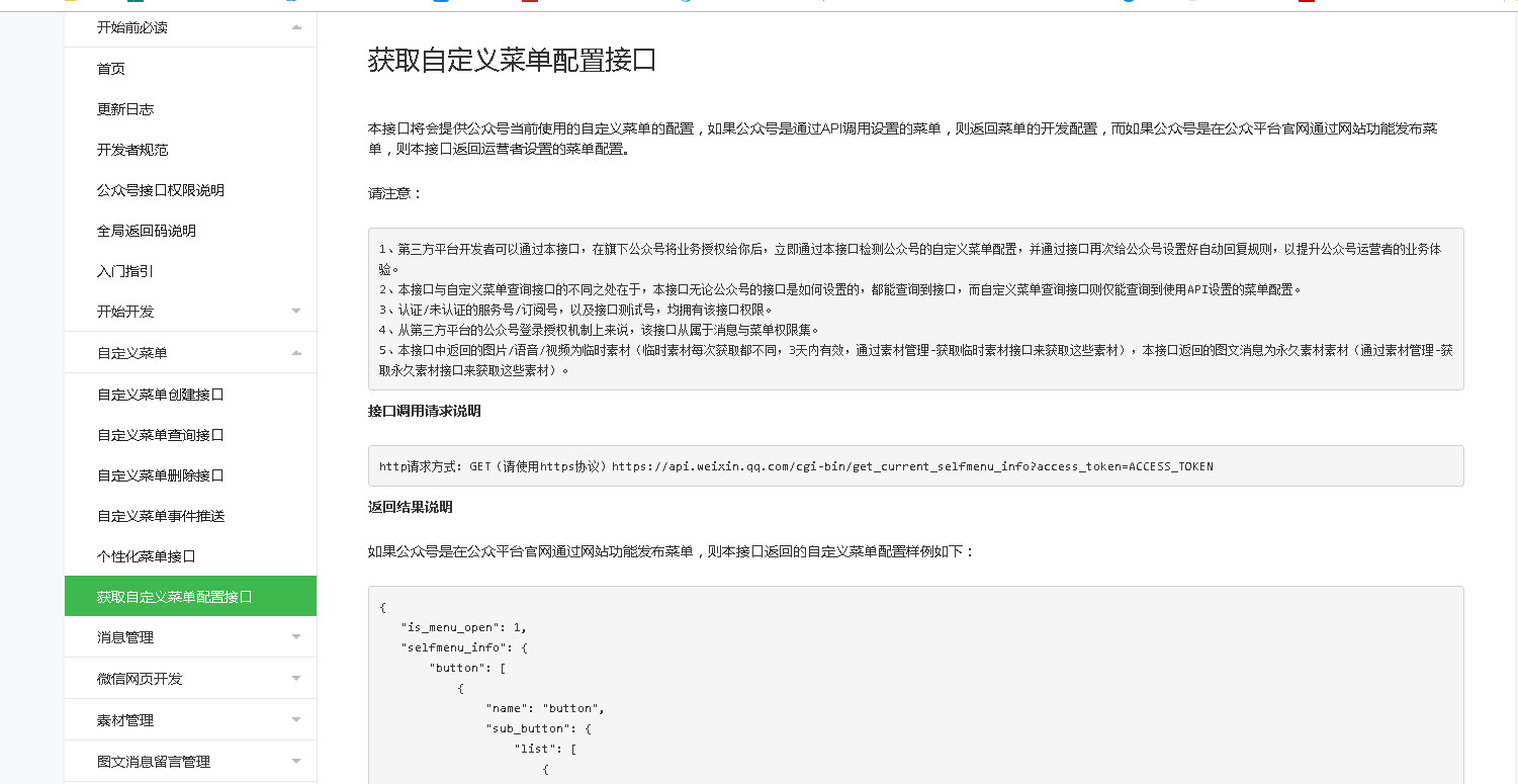 官方这个接口的例子上就有,奇怪的是这个接口获取下来的菜单用创建接口提交就出现我那个错误!菜单式事先用户在公众号内的菜单设置建立的;