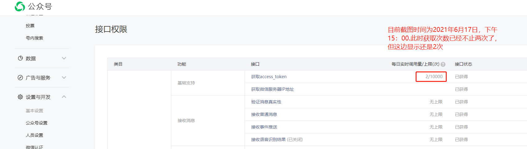 如图,公众号管理平台中,获取access_token的每日实时调用量次数统计小于实际的调用量次数。该公众号每日获取access_token至少在10次以上,而现在一直只显示调用了2次。超过两次之后,比如到达了3次,过一会就被重置为2次了。是什么问题,麻烦排查一下。