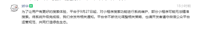 官方说:为了让用户有更好的搜索体验,平台于9月27日起,对小程序搜索功能进行系统维护,部分小程序搜索能力可能会有所影响。待系统升级完成后,我们会发布相关通知。平台会不断优化搜索能力,也请开发者遵守微信公众平台运营规范,共同打造绿色生态。
