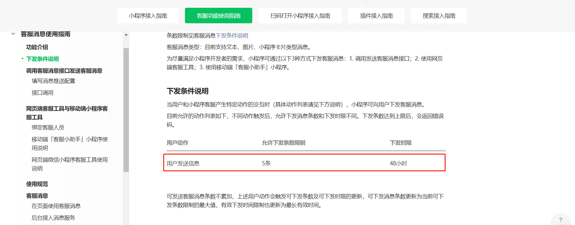 微信开发官方给出限制是:下发5条。这边的理解:用户A 发送1条消息后,且48小时内,客服就可以连续下发5条消息给用户A; 若用户A继续回复一条,客服又可以下发5条。 难道不是这样的么?