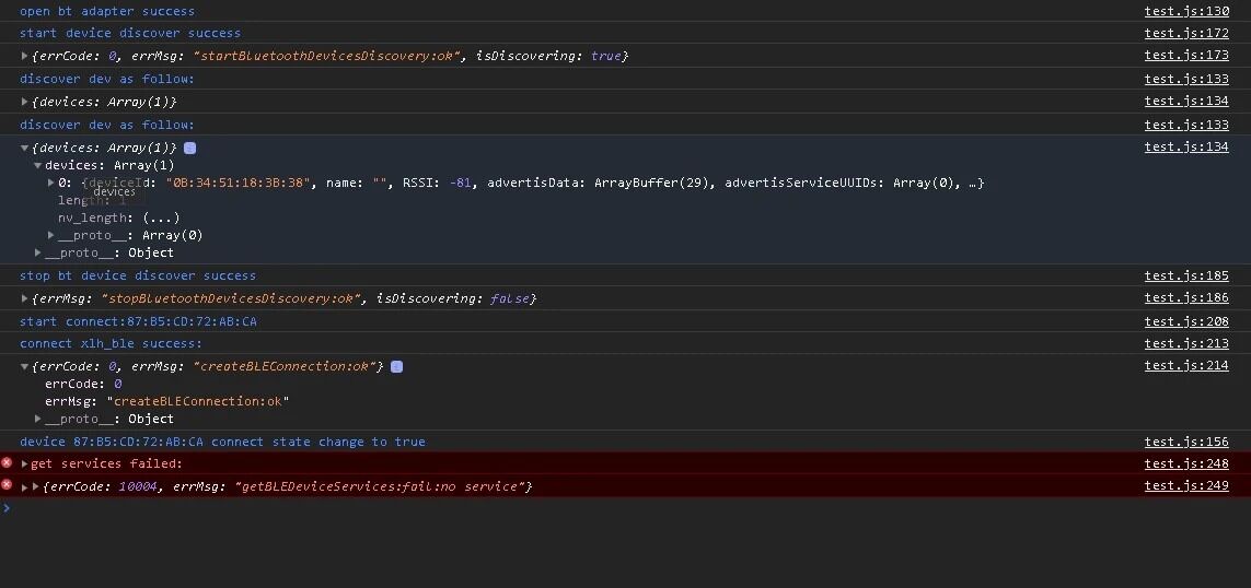 2、接上一步,断开连接->关闭适配器->打开适配器->搜索->连接->获取服务(wx.getBLEDeviceServices),这次会失败,后续一直都会失败,也就是说重新打开手机蓝牙之后只能成功操作一次。