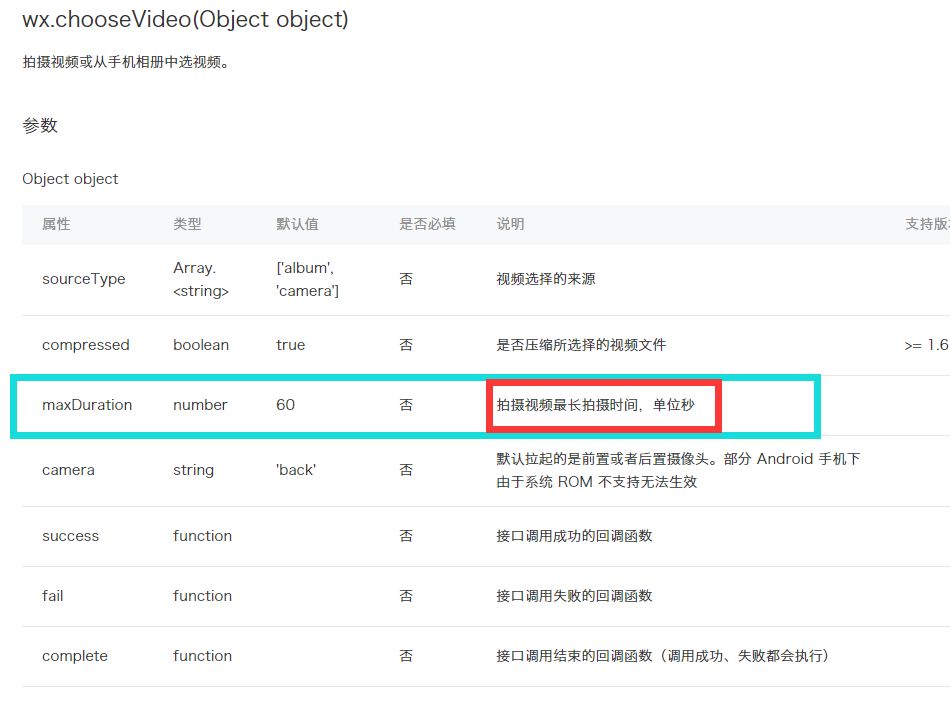 今天发现这个api 改版了, 之前最大60秒的说明不见了, 设置了之后.安卓手机还是跟之前一样不能自动卡断60秒,需要手动判断时长.