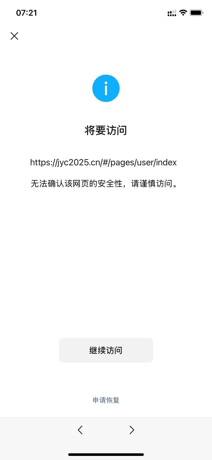 我的网站已经加入了微信服务号,但是在微信里面打开,请谨慎访问?如下图。 公司网址:https://jyc2025.cn/,网站也备案了,备案号:沪ICP备2025124833号-1。申请恢复很多次了,没有任何效果,也没有收到来自腾讯公司的回复,现在不知道怎么处理?所以烦请管理员回答一下好吗?谢谢。