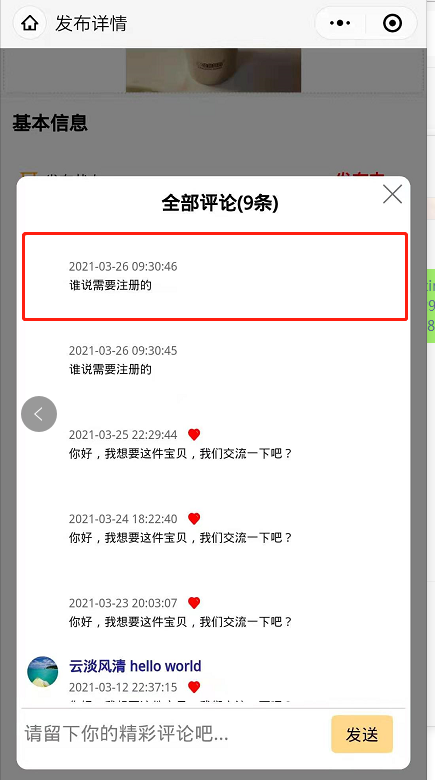 我的小程序是为社区居民提供交流平台,大家可以分享自己闲置物品出来,如果其他人对物品有意向可以点击物品详情页面中的一个按钮给发布者留言。但所有能进到物品详情界面并点击按钮留言的用户必须先要在小程序中注册,未注册的账户是进不到这个页面的。