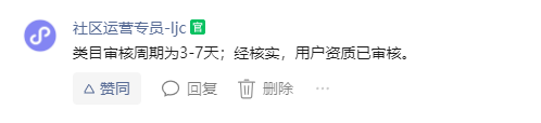 类目审核周期为3-7天;经核实,用户资质已审核。