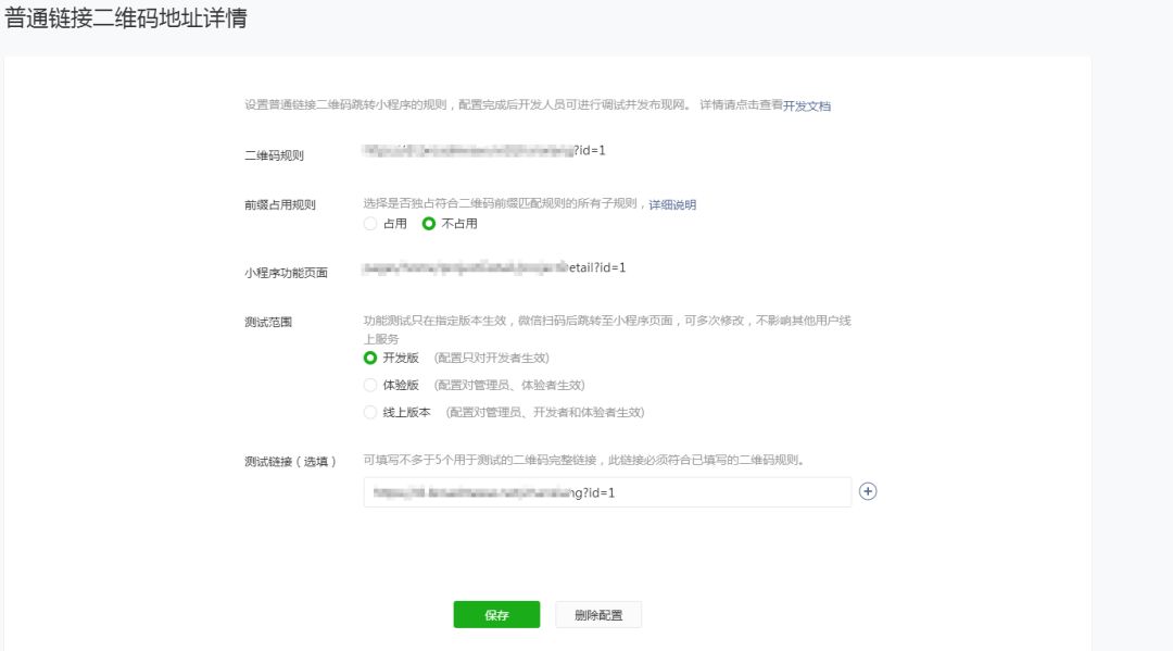 如图所示,我在小程序后台通过配置了二维码规则、小程序功能页面、测试连接之后,通过扫描测试连接中参数id为1的二维码连接可以跳转到当前的小程序id为1 的页面,但是将id改成2就报页面不存在,这个id理论上来讲应该是变化的,请问一下如何将这个id配置成动态的?即扫描id=2的二维码连接,跳转到相应小程序id为2的页面?急急急!请大牛们指导!!!