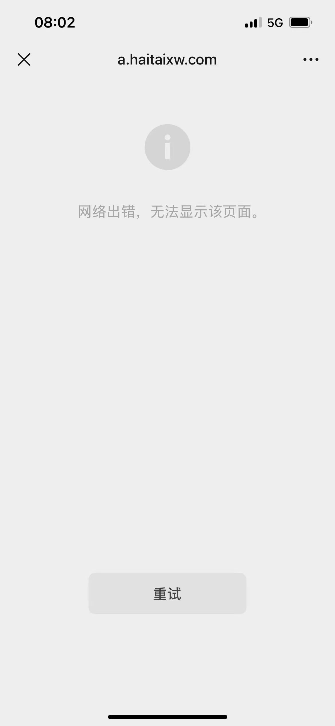 您号,我司公众号(AppID:wxda06e0fa8d213fe6)链接(例如:https://a.haitaixw.com/app/scan?type=ap3200&number=5f629d04/ff)在Android版微信和微信开发者工具上打开正常(基本排除链路问题),但在多个版本的iOS版微信(多个版本的iOS都试过,都有一样的问题)上打开会提示“网络出错,无法显示该页面”(页面在iOS自带的safari浏览器上打开正常,只有微信里打不开。默认页面没针对iOS做特殊处理,有时用空白页面也无法打开)。经过多次刷新又可以正常打开了,第一次打开后再次打开公众号的其他链接也能正常打开了,但退出微信进程后再次打开就又出现“网络出错,无法显示该页面”,又需要多次刷新才可以。因公众号页面没有真机调试机制,我们无法自行解决,希望协助调试改进,给出调试思路,非常感谢!