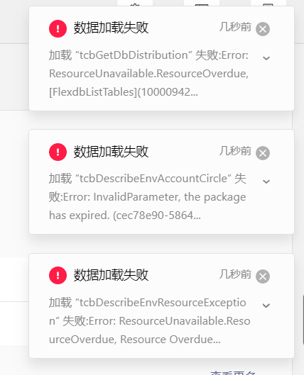 打开云开发控制台,界面报错(加载 tcbGetDbDistribution失败: Error: ResourceUnavailable.ResourceOverdue)如下图所示: