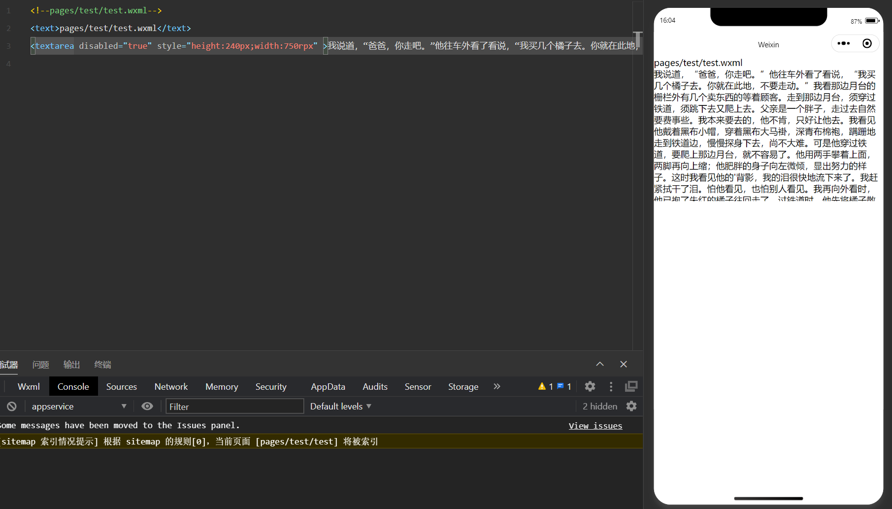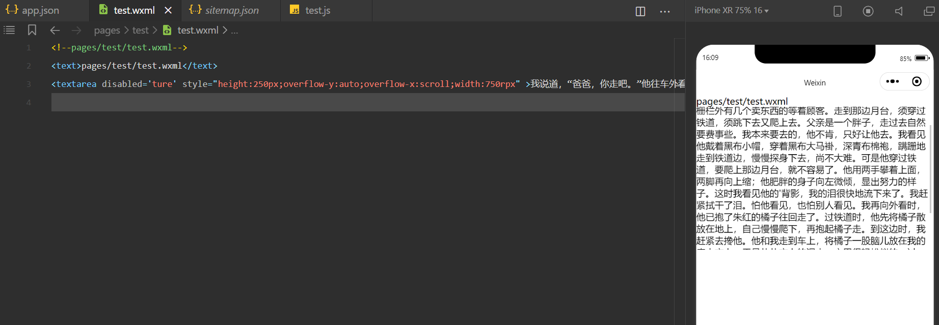 <textarea disabled='ture' style="height:250px;overflow-y:auto;overflow-x:scroll;width:750rpx" >我说道,“爸爸,你走吧。”他往车外看了看说,“我买几个橘子去。你就在此地,不要走动。”我看那边月台的栅栏外有几个卖东西的等着顾客。走到那边月台,须穿过铁道,须跳下去又爬上去。父亲是一个胖子,走过去自然要费事些。我本来要去的,他不肯,只好让他去。我看见他戴着黑布小帽,穿着黑布大马褂,深青布棉袍,蹒跚地走到铁道边,慢慢探身下去,尚不大难。可是他穿过铁道,要爬上那边月台,就不容易了。他用两手攀着上面,两脚再向上缩;他肥胖的身子向左微倾,显出努力的样子。这时我看见他的'背影,我的泪很快地流下来了。我赶紧拭干了泪。怕他看见,也怕别人看见。我再向外看时,他已抱了朱红的橘子往回走了。过铁道时,他先将橘子散放在地上,自己慢慢爬下,再抱起橘子走。到这边时,我赶紧去搀他。他和我走到车上,将橘子一股脑儿放在我的皮大衣上。于是扑扑衣上的泥土,心里很轻松似的。过一会儿说,“我走了,到那边来信!”我望着他走出去。他走了几步,回过头看见我,说,“进去吧,里边没人。”等他的背影混入来来往往的人里,再找不着了,我便进来坐下,我的眼泪又来了。</textarea>