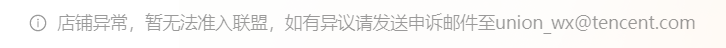 店铺异常,暂无法准入联盟,如有异议请发送申诉邮件至union_wx@tencent.com