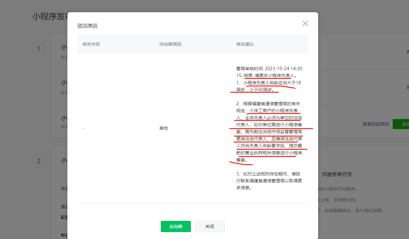 我前几天认证一个小程序,是个体工商户的,认证通过后,小程序要求需要通信局备案审核后才能上线小程序, 按照要求上传备案信息后,通信局驳回备案资料,说小程序负责人年龄应当大于18周岁,小于60周岁,要我们重新更换法定代表人,但是个体工商户又不能直接变更法定代表人,请问我已经交了300认证费了,这要怎么解决