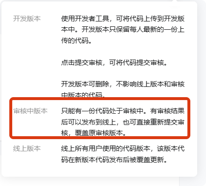 你好,审核将以实际提交的版本服务内容为准哈,详情可参考,小程序版本说明:https://developers.weixin.qq.com/miniprogram/dev/framework/quickstart/release.html#%E5%8F%91%E5%B8%83%E4%B8%8A%E7%BA%BF