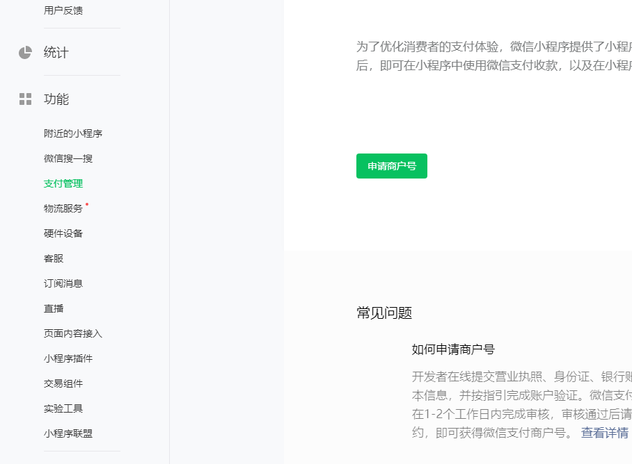 为提升小程序的实物购买体验,平台近期开始对部分小程序灰度升级小程序支付管理服务。新开小程序如被灰度“小程序支付管理”功能,需要在该页面申请商户号,并使用下述链接接口,不支持调用微信支付接口,文档地址https://developers.weixin.qq.com/miniprogram/dev/platform-capabilities/business-capabilities/ministore/wxafunds/API/order/create_order.html