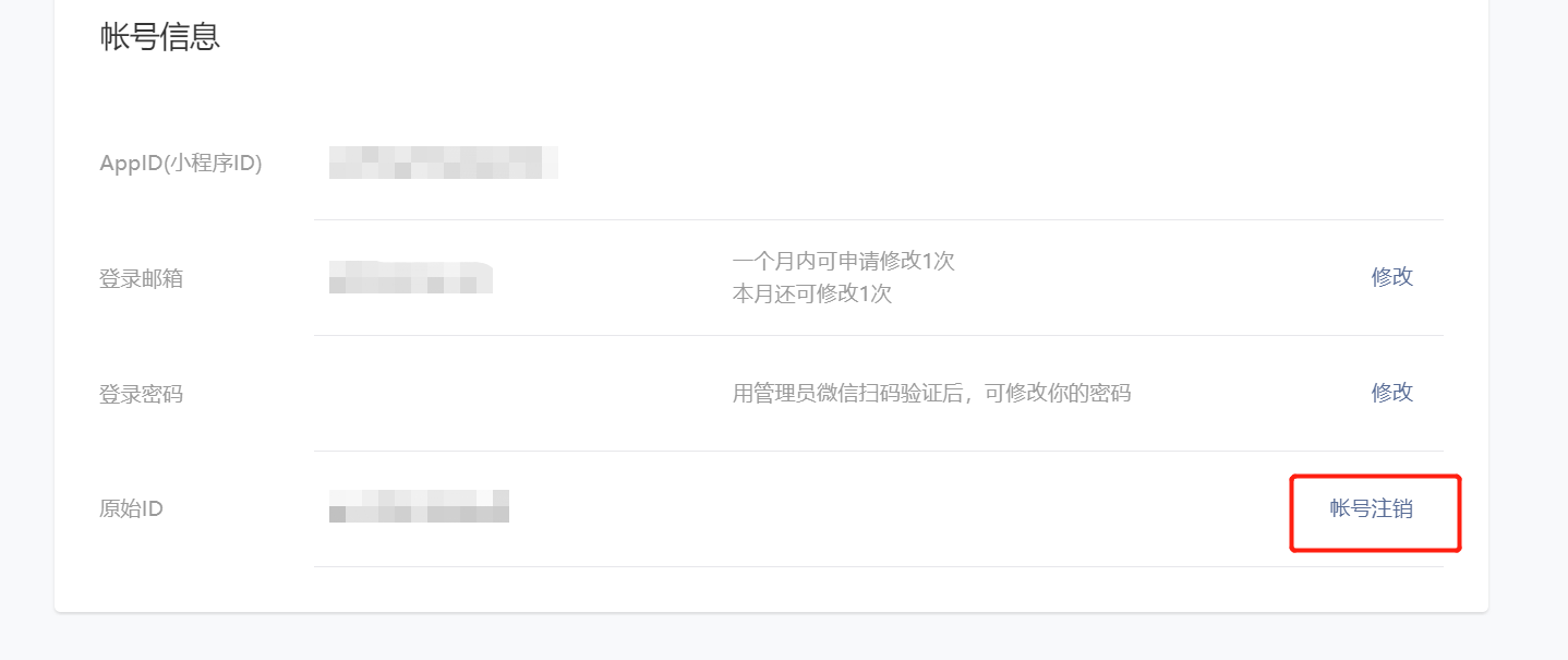 小程序后台,设置-基本设置-(底部)账号信息-账号注销