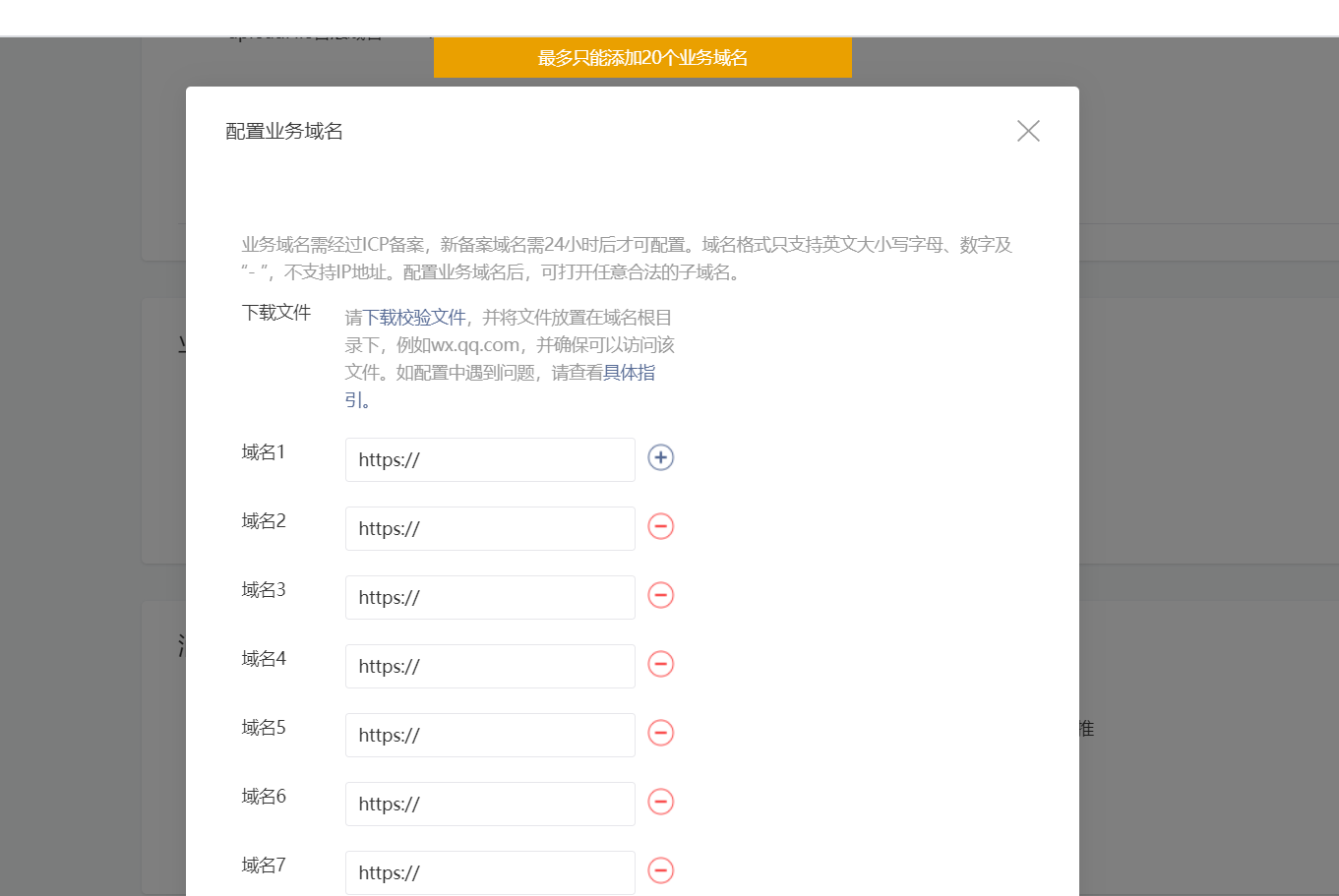 想给 second.allgf.com.cn 设置为小程序业务域名,但是老是显示域名绑定小程序最多20个。