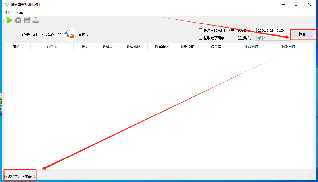 微信打单软件拉取不了面单,一直提示网络异常,正在重试