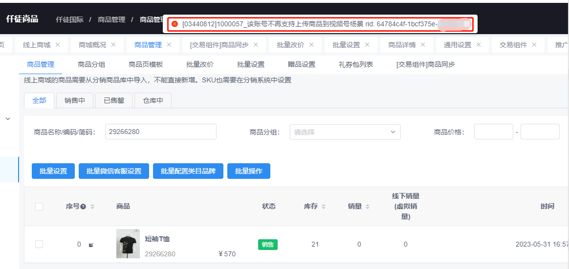 我们使用的三联erp系统,网页版有小程序商店,通过后台编辑好商品之后想通过交易组件同步到视频号场景,用于其他视频号的直播,结果提示:1000057 该账号不再支持上传商品到视频号场景,请问这个怎么解决?
