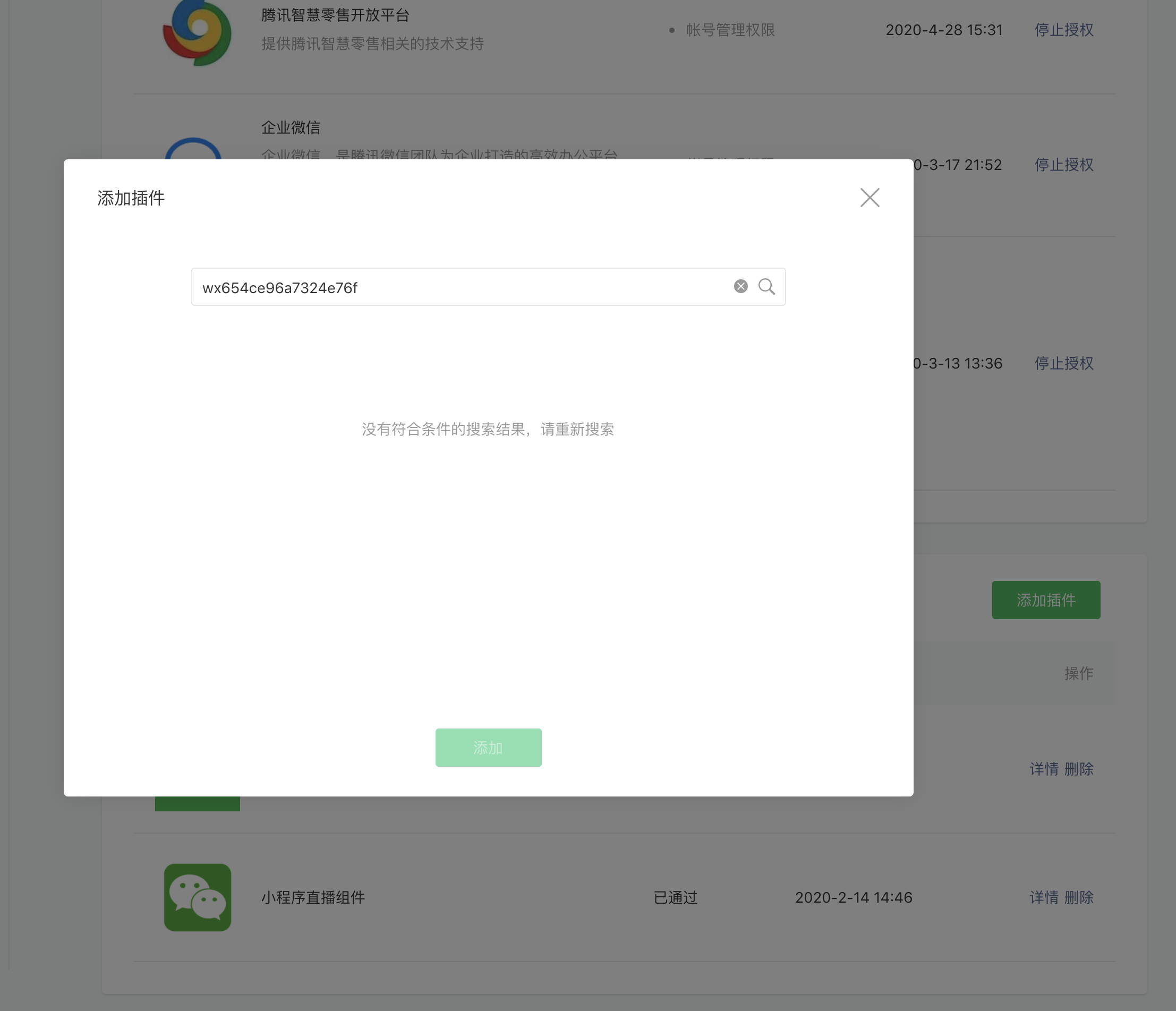 MP后台添加插件的时候搜索不到appid(wx654ce96a7324e76f)的插件,但是营销馆返回的appid:wx654ce96a7324e76f,path:pages/hall?hall_code=5u0PT1TC0SaSzWkk_s8KuA&t=i_2C82CsFf_AO5Sq7dglF_bHrgSo1Ejs7F9EEBfuDr4,