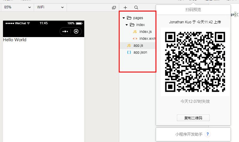 通过编写以上短短的几行代码,微信开发者工具的模拟器界面上显示出Hello World。