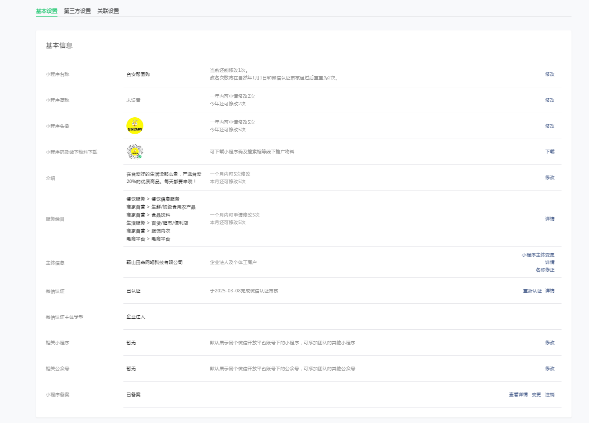 我想问一下,公众号微信小程序名称,台安帮团购网网字已经去掉了,为什么备案还显示小程序名称与营业执照无关联是什么意思?