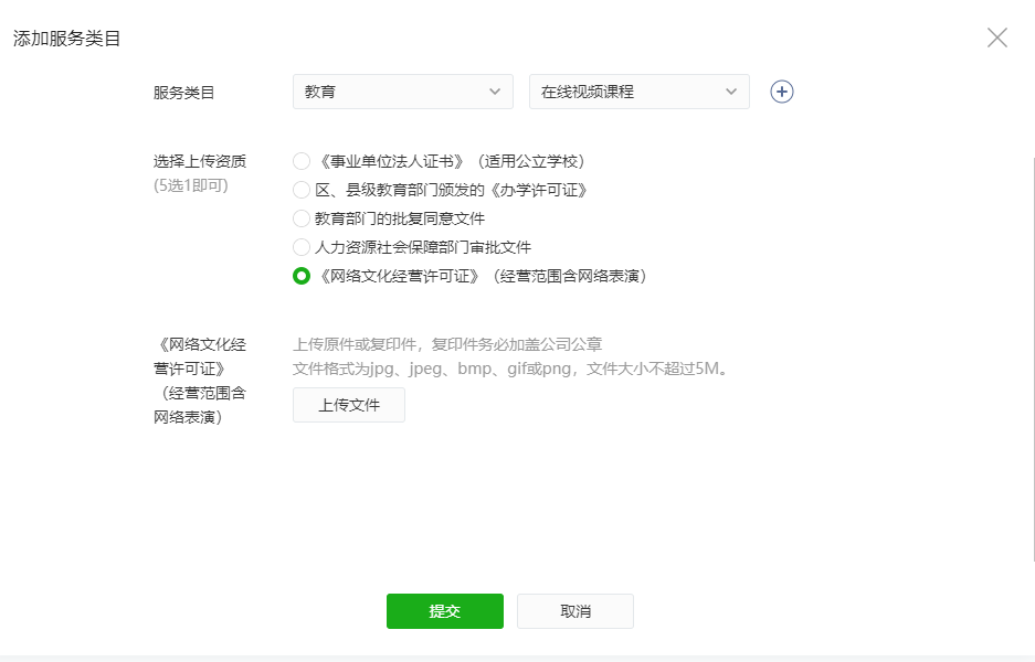 你好,涉【教育-在线视频课程】类目,需提交资质(5选1):