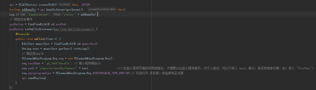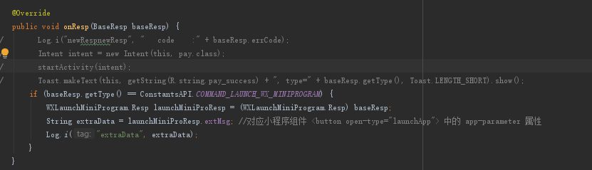 备注:以上步骤第一次执行可以返回到APP没调用onResp方法。然后android手机点击退回按钮后,会返回到小程序,然后再点击返回APP,就可以回调onResp。