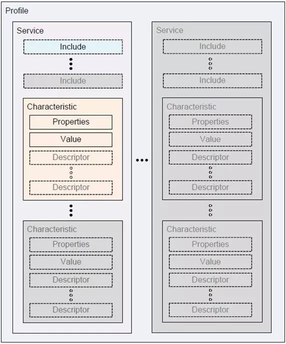 在整个通信过程中,有三个最主要的概念:配置文件(Profile)、服务(Service)、特性(Characteristic)。