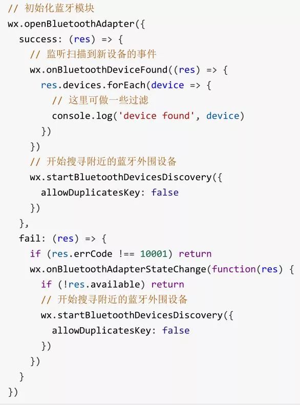 扫描并发现蓝牙外设。如果蓝牙功能未开启,可监听蓝牙状态变化以便自动进入下一步,提升用户体验。