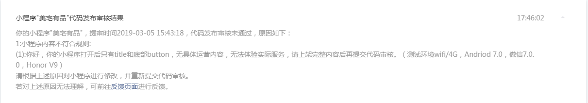 你好,经核实,贵方小程序:1.扫码进入会自动定位审核人员当前位置,建议在版本描述中写明已上架正式内容的城市,以便审核人员审核;2.【个人中心-申请入驻】涉及商家入驻/店铺街入口,需补充选择电商平台类目或者建议去掉该模块内容,改成商家自营模式