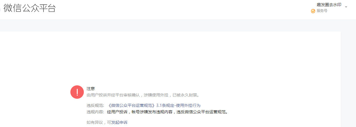 微信公众号(趣发圈去水印)无缘无故提示涉嫌使用外挂永久封号,我是给公司运营的,现在公司里面一直追责我这边,我跟客服反馈每次回复都一样,打客服电话每次都是半小时以上,也给不了任何说明。。最重要是公众号刚认证通过的,还没有投入使用,总粉丝十来个人,说是使用外挂?希望工作人员也能给个准确信息,使用的什么外挂?哪里的违规?我也好给公司交代,现在年后开工了,公司一直追责我这边,急死人啊!!