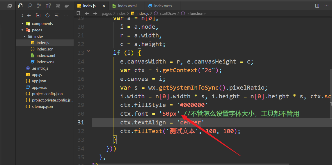 如题canvas画布设置字体大小,不管怎么设置,在开发者工具不生效没效果,代码片段